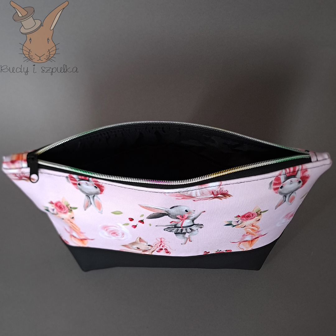Kosmetyczka z motywem zwierzęcym to idealny wybór dla osób ceniących ręcznie robione dodatki, które łączą w sobie funkcjonalność, styl i unikalny charakter. Wykonana z wysokiej jakości materiałów – wodoodporna tkanina u góry oraz elegancka czarna ekoskóra na dole – zapewnia trwałość i odporność na zabrudzenia. Różowo-czarna kolorystyka doskonale współgra z uroczym motywem baletnic wśród zwierzątek, co czyni ją nie tylko praktycznym, ale i niezwykle estetycznym dodatkiem.