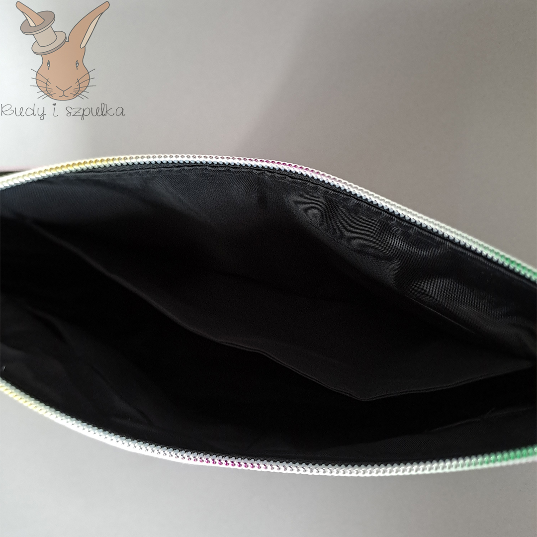 Wnętrze kosmetyczki wykończone zostało czarną podszewką, co dodatkowo podkreśla jej elegancki charakter i zwiększa trwałość. W środku znajdziesz kieszonkę oraz przegródki na pędzle lub inne rzeczy.