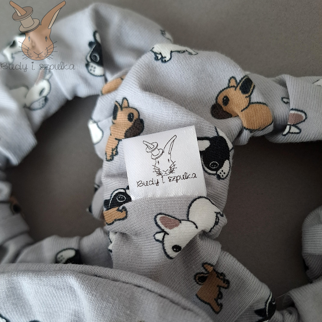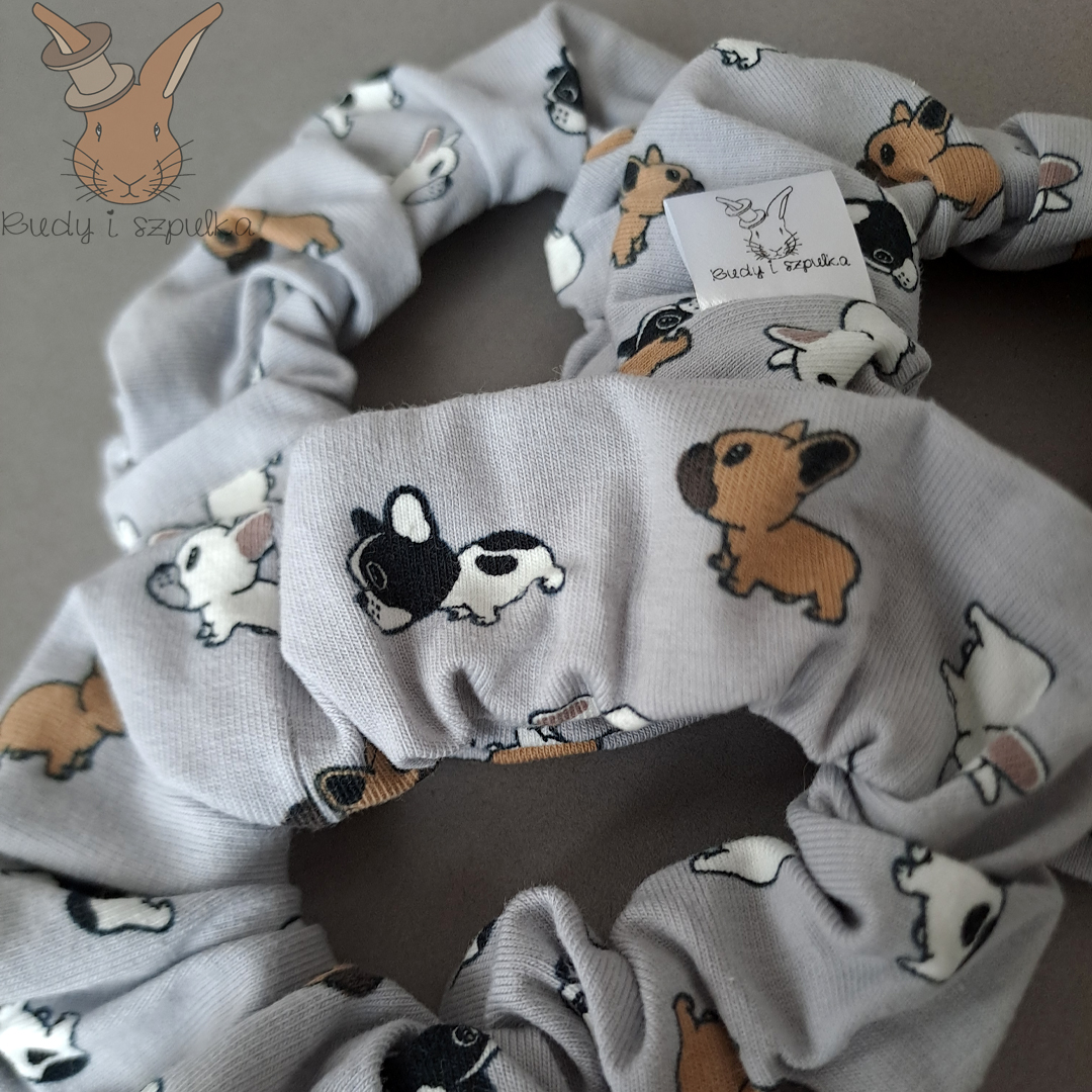 Motyw wesołych buldogów na szarym tle dodaje całości charakteru i sprawia, że scrunchie doskonale pasuje zarówno do codziennych, jak i bardziej eleganckich stylizacji. Dzięki użyciu elastycznej dzianiny scrunchie dobrze trzyma włosy, nie zsuwając się i nie powodując dyskomfortu.