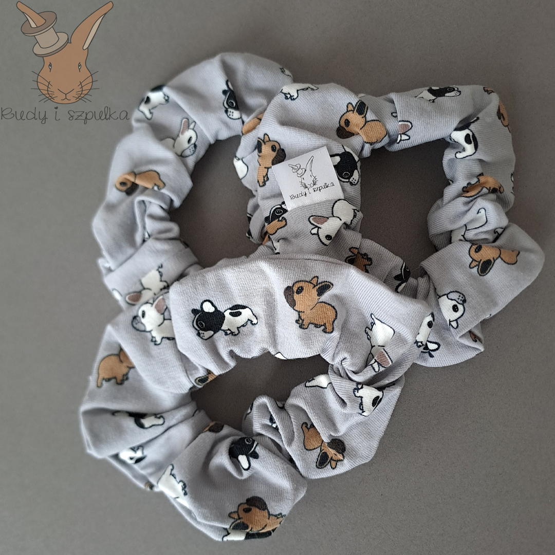 Miękka, ręcznie wykonana scrunchie z dzianiny z motywem buldogów. Nie niszczy włosów i stylowo uzupełnia każdą stylizację. Twoje włosy Ci się odwdzięczą!