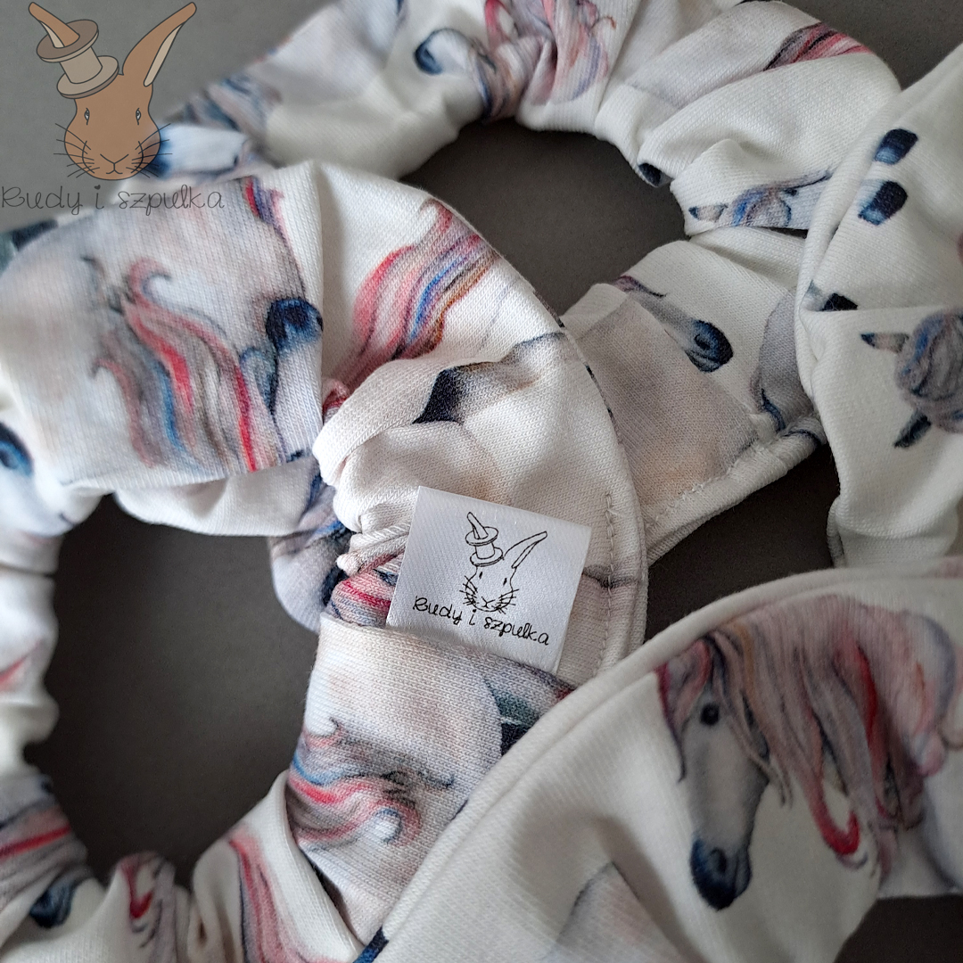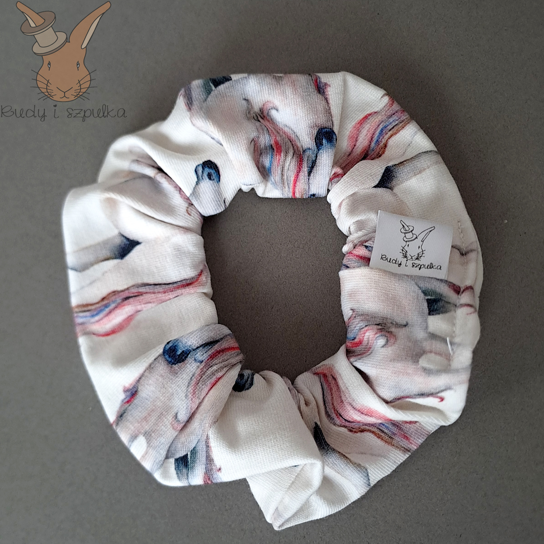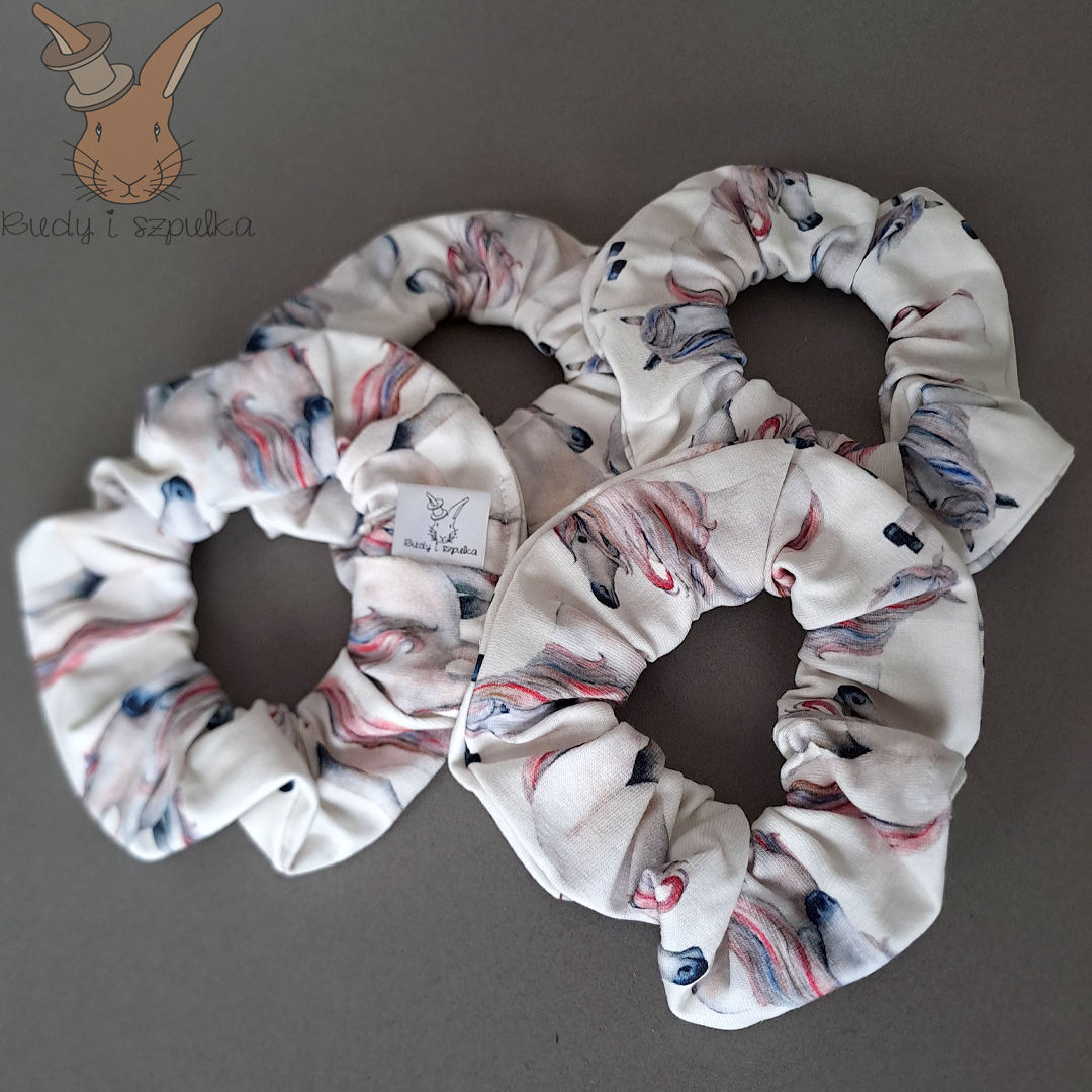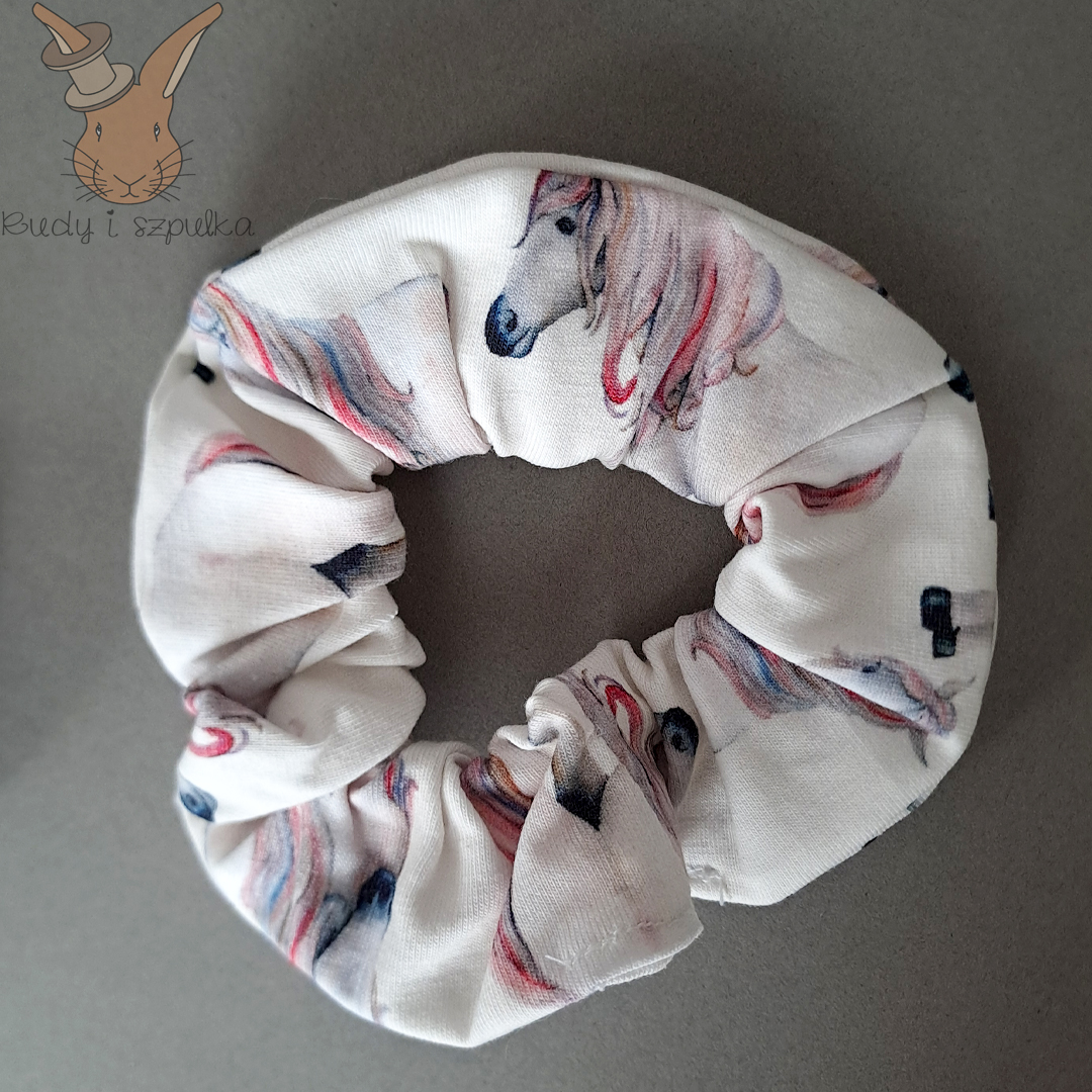 Miękka, ręcznie robiona scrunchie z dzianiny z motywem konia. Delikatna dla włosów, idealna do codziennych i eleganckich fryzur. Twoje włosy Ci podziękują!