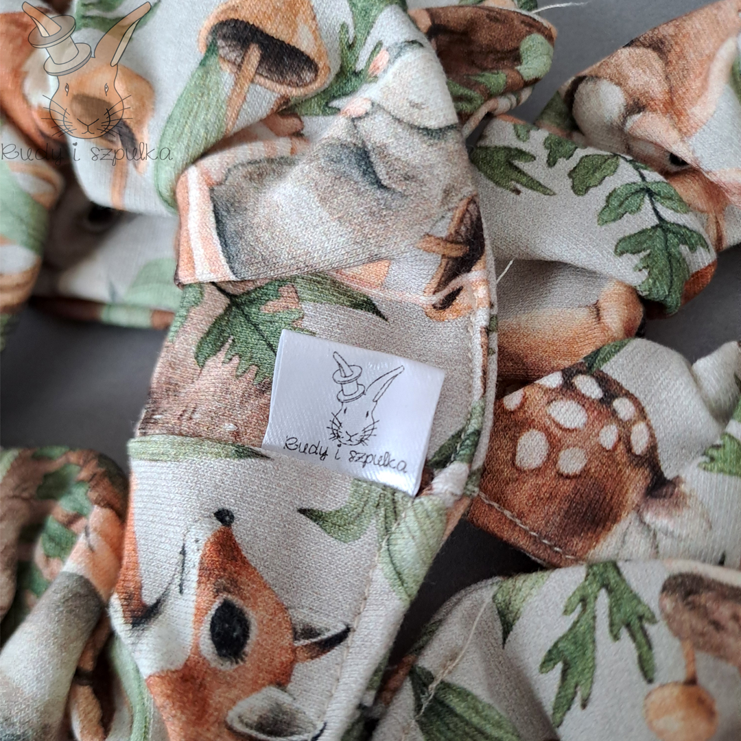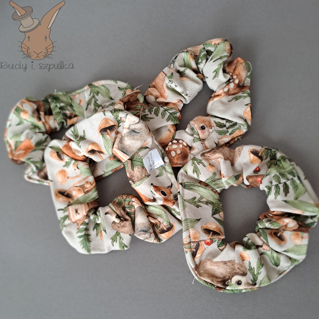 Ręcznie wykonana scrunchie z miękkiej dzianiny, w kolorze beżowym z leśnym motywem. Idealna do codziennych i eleganckich fryzur. Wyjątkowa dla Ciebie.