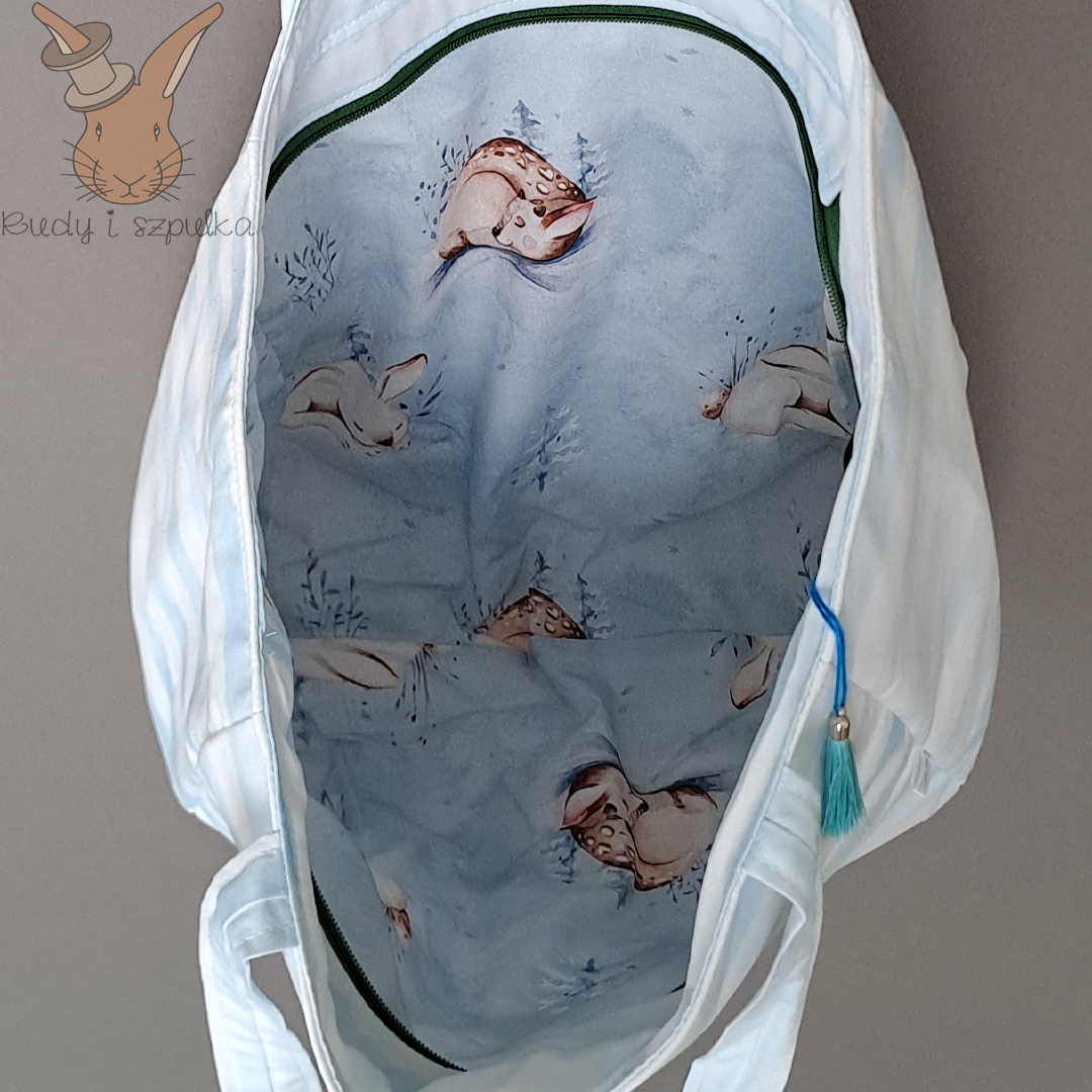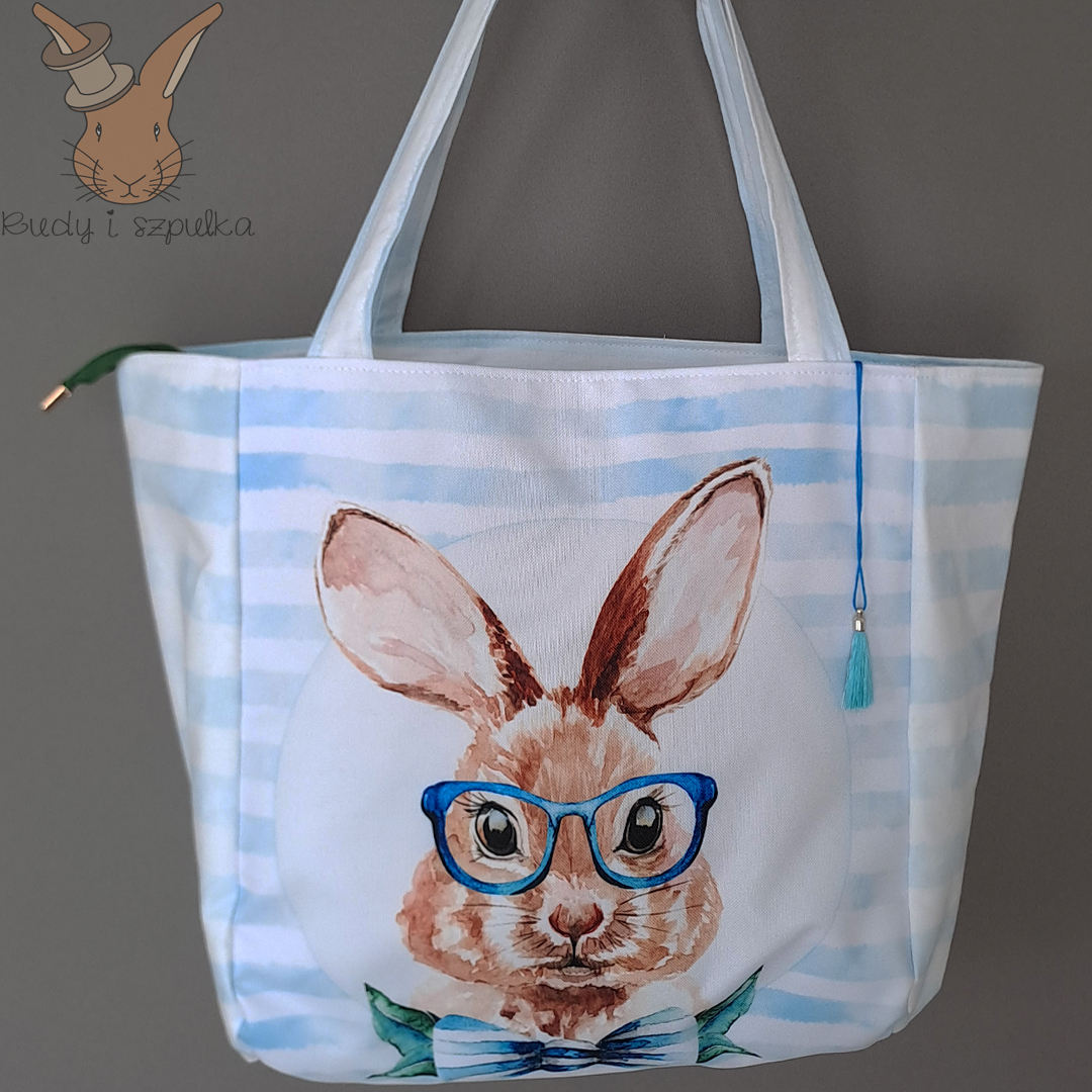 Ręcznie robiona torebka bawełniana królikiem. Stylowa, pojemna i praktyczna – z unikalną wodoodporną wstawką i miękką podszewką. Pomieści wszystkie potrzebne skarby.