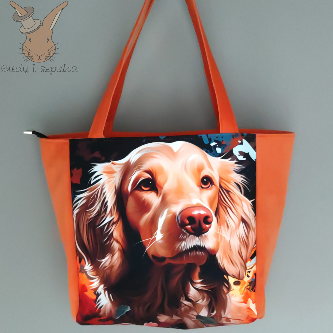 R臋cznie robiona torebka z weluru w pomara艅czowym kolorze z motywem Cocker Spaniela. Pojemna, mi臋kka i stylowa, z bawe艂nian膮 podszewk膮 w z艂ote groszki.