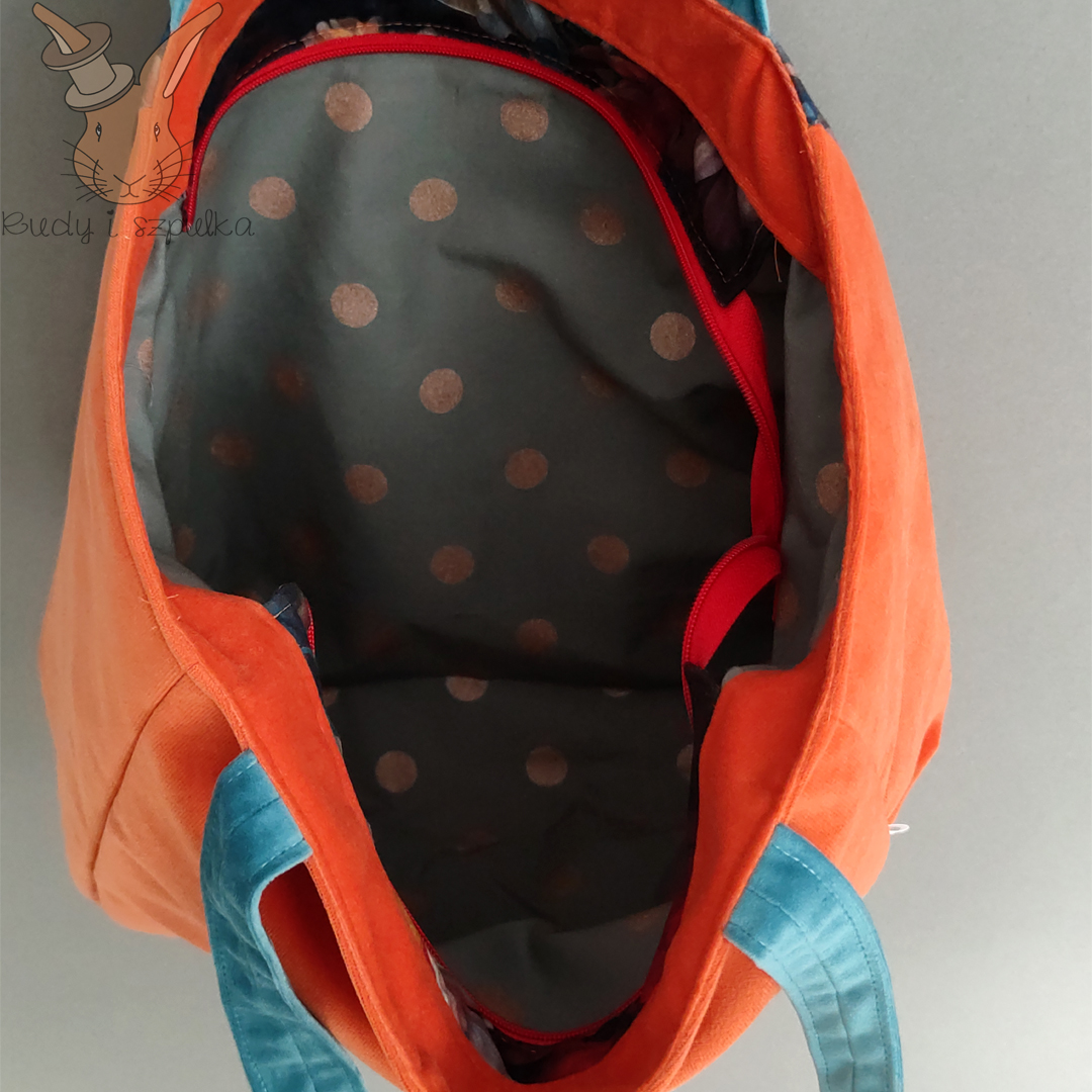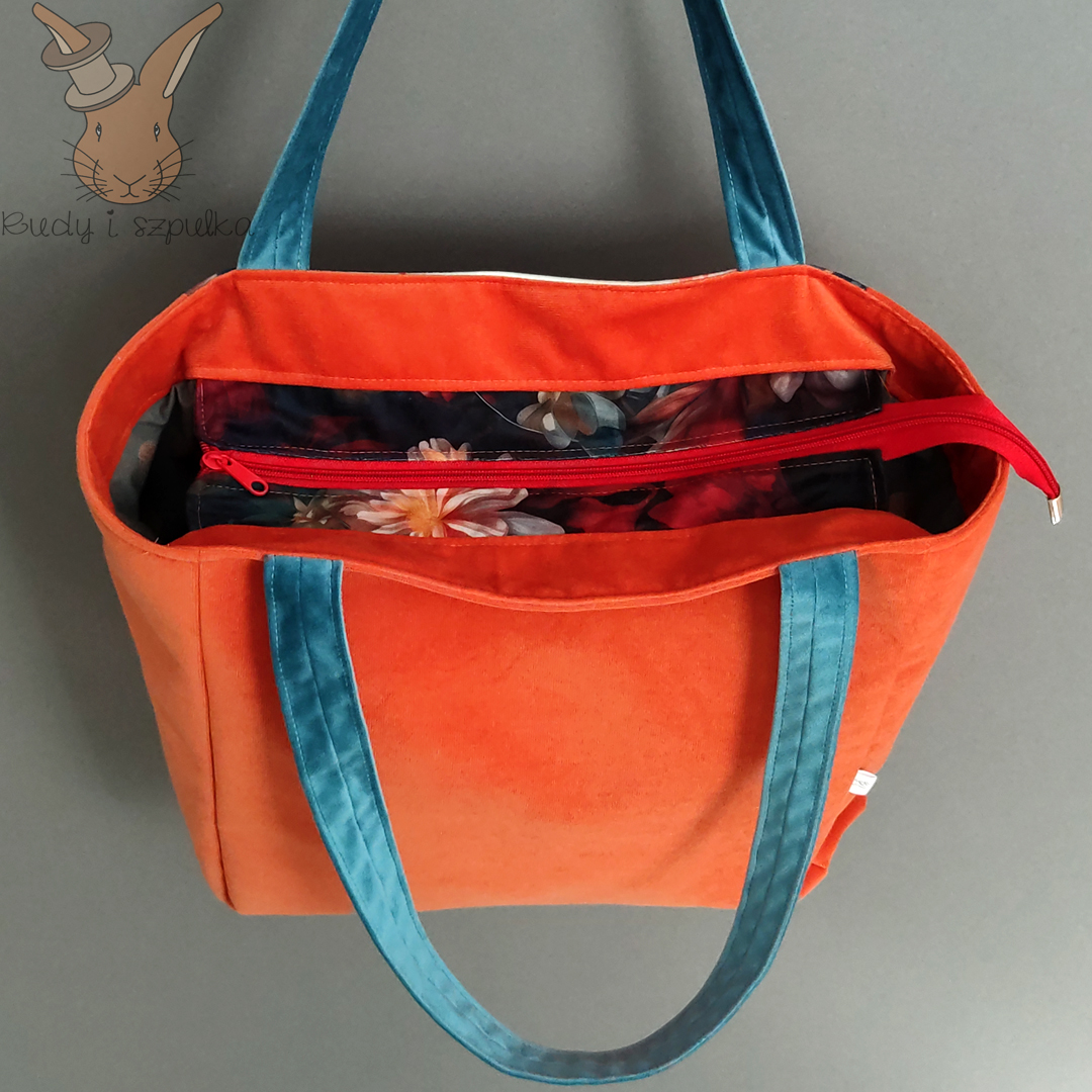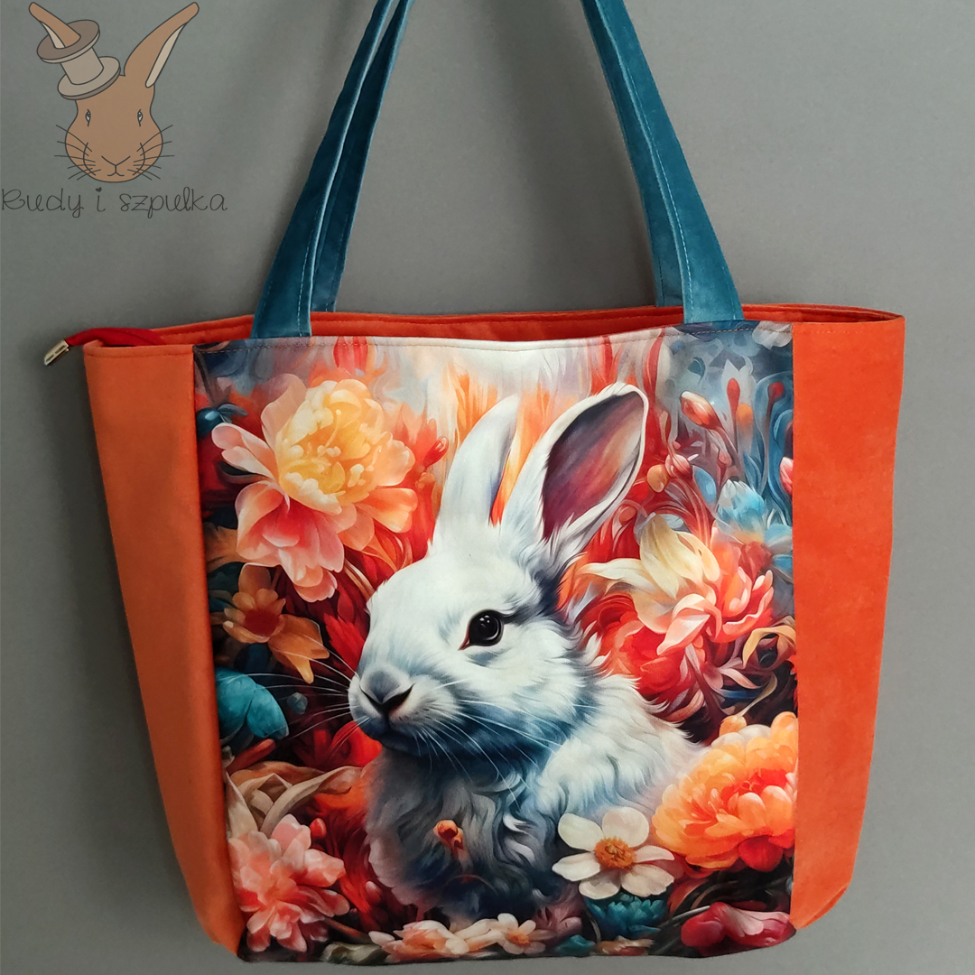 Welurowa torebka z motywem królika w kolorach pomarańcz-turkus. Pojemna (ok. 34x47x31 cm), z bawełnianą podszewką w złote grochy. Styl i funkcjonalność w jednym!