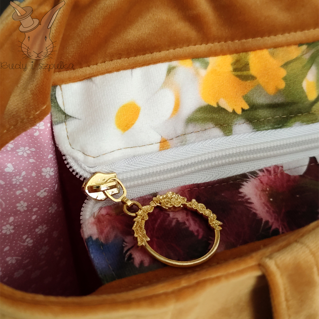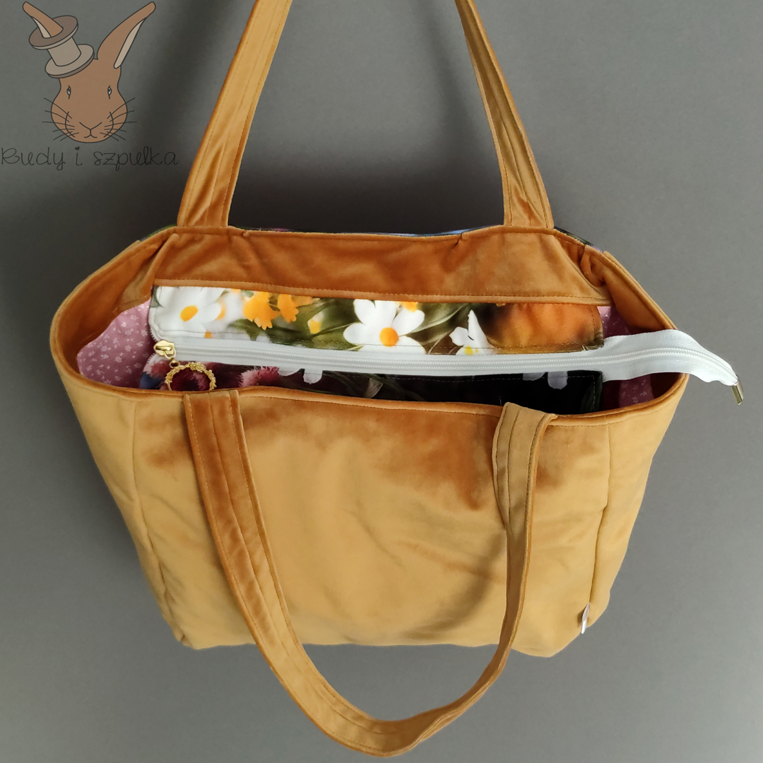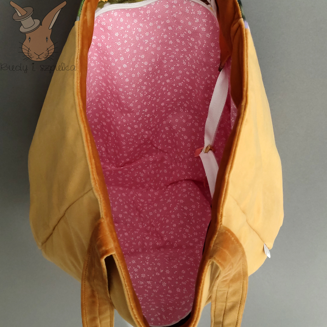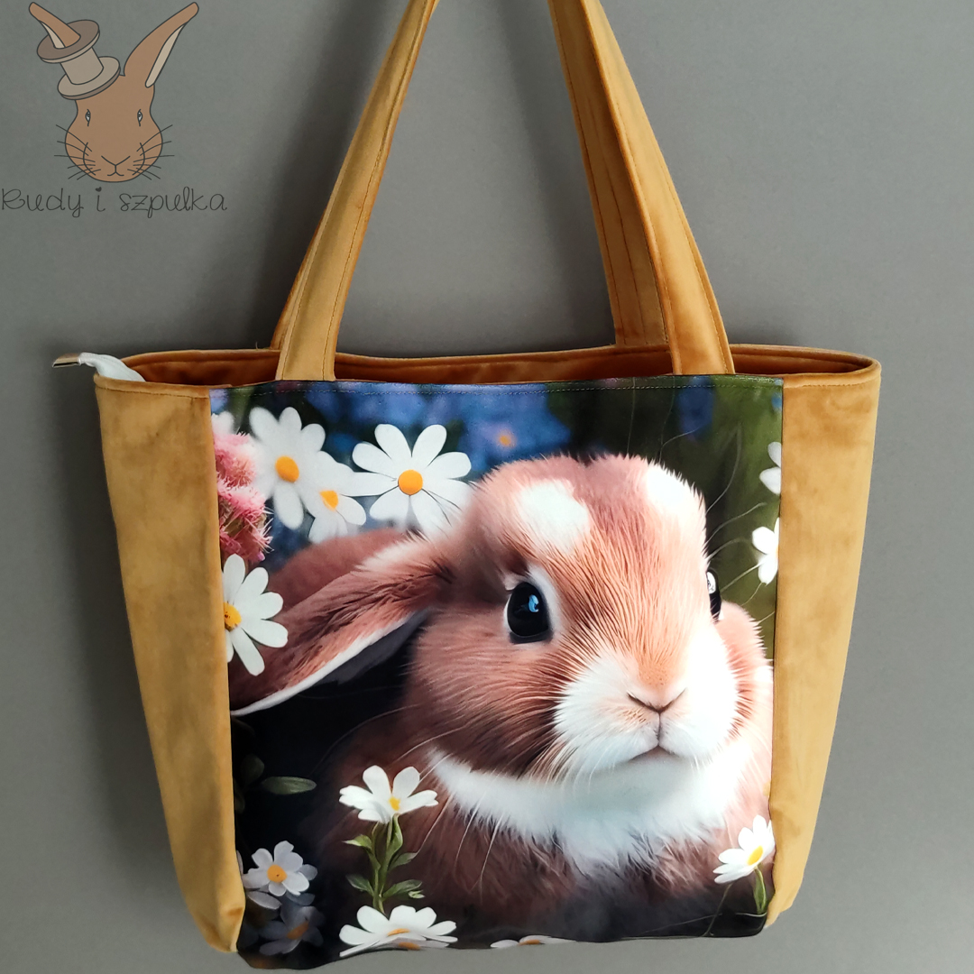 Stylowa torebka z weluru z króliczym motywem. Musztardowy kolor, różowa podszewka w kwiatki. Wymiary ok. 34x47x31 cm – praktyczna i oryginalna.