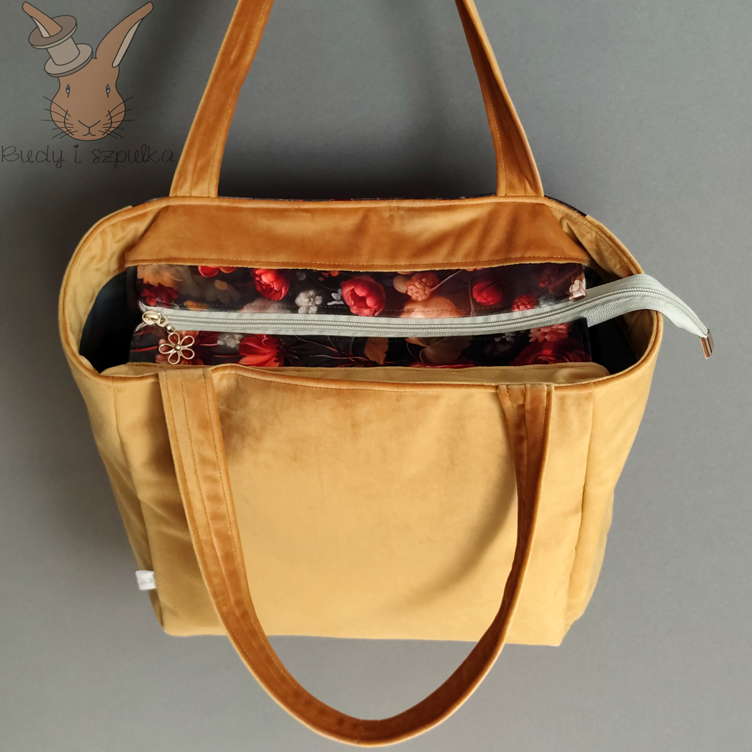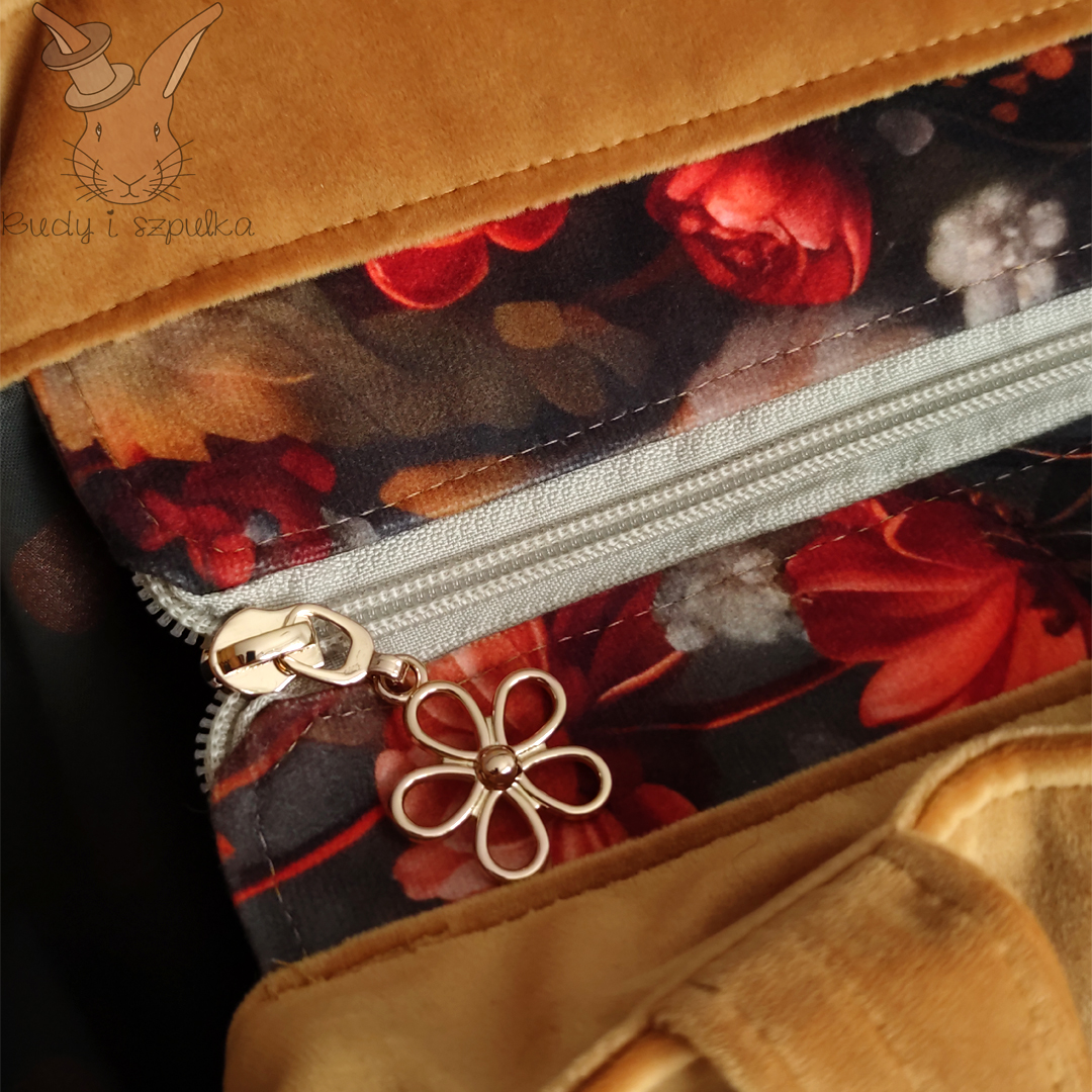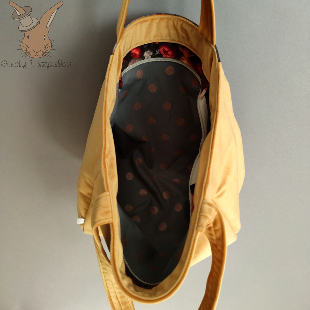 Ręcznie wykonana torebka welurowa z motywem Szpica Miniaturowego, Pomeraniana, w musztardowym kolorze, z elegancką bawełnianą podszewką. Styl i funkcjonalność w jednym!