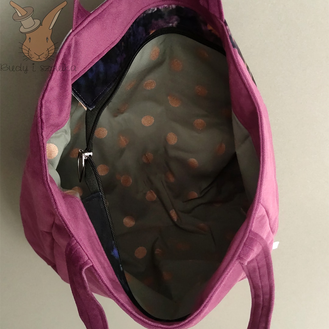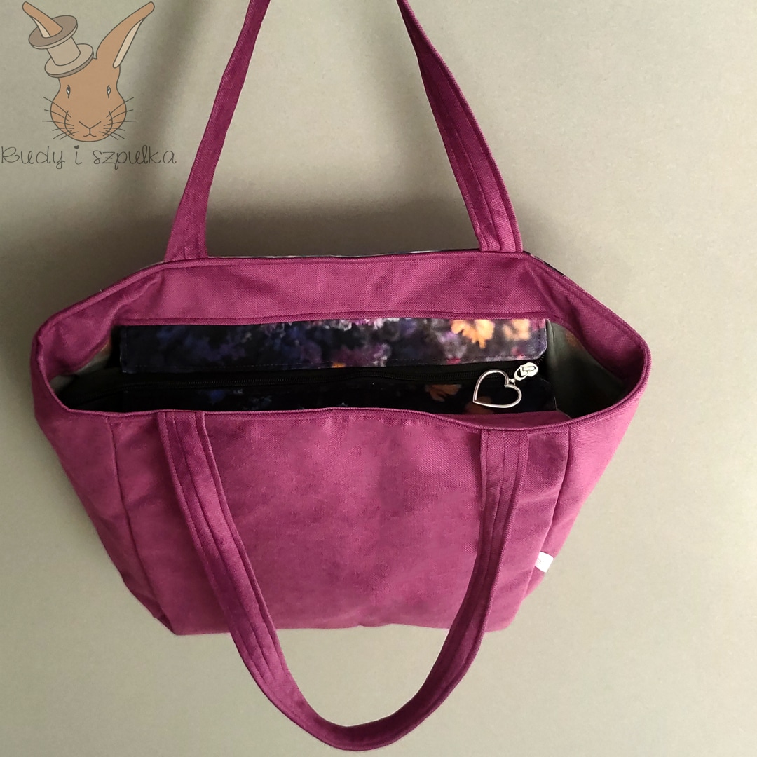 Ta wyj膮tkowa torebka w kolorze fioletowego wrzosu ma wymiary: wysoko艣膰 oko艂o 34 cm, szeroko艣膰 g贸ry oko艂o 47 cm, szeroko艣膰 do艂u oko艂o 31 cm i g艂臋boko艣膰 oko艂o 19 cm. Wn臋trze zdobi bawe艂niana podszewka w eleganckim odcieniu szaro艣ci z subtelnym wzorem z艂otych groch贸w. Te proporcje sprawiaj膮, 偶e jest idealnym towarzyszem na r贸偶ne okazje – zar贸wno na co dzie艅, jak i podczas podr贸偶y.