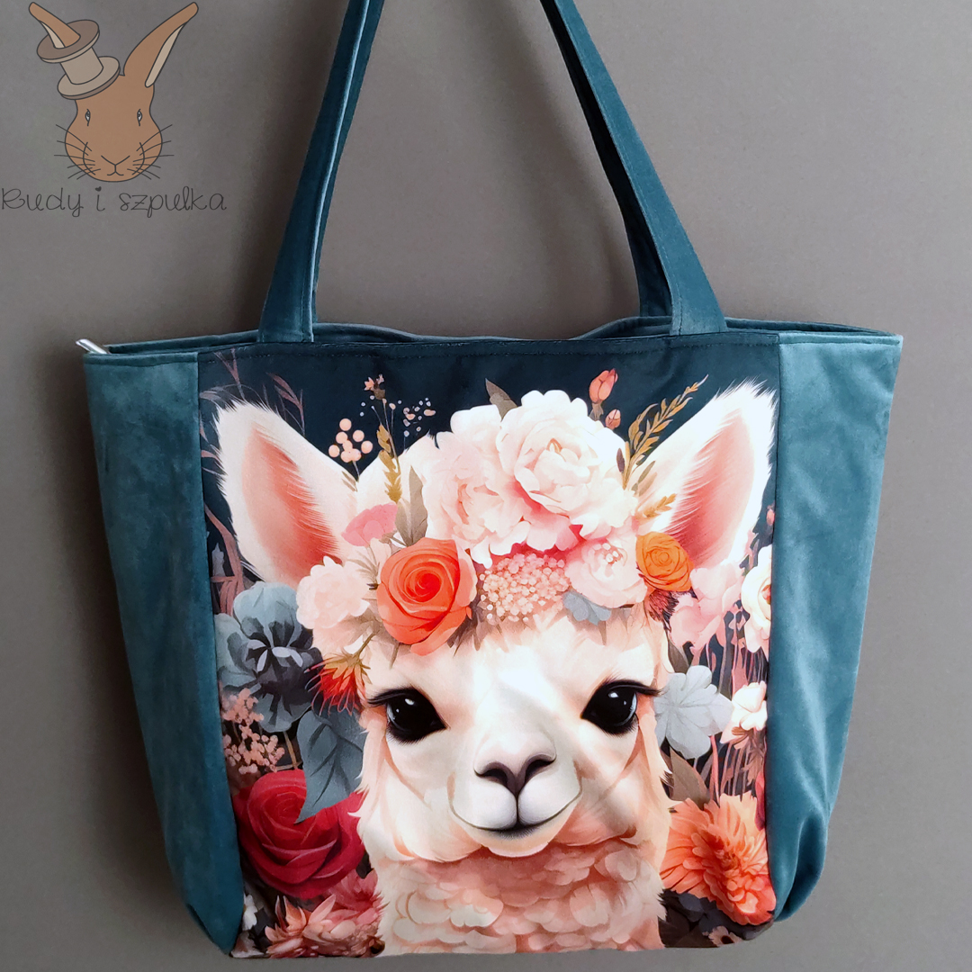 Wyjątkowa torebka welurowa z motywem lamy w turkusowym kolorze, ręcznie szyta. Wnętrze z bawełnianą podszewką w drobne, białe kwiaty. Stylowa i bardzo pojemna.